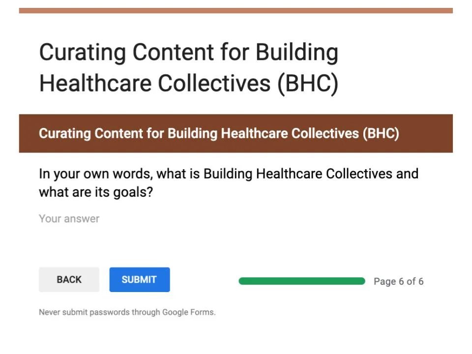 In this section of the Google Form, the goal of the questions were to see what people wanted Building Healthcare Collectives to be and if the whole team was on the same page or not.